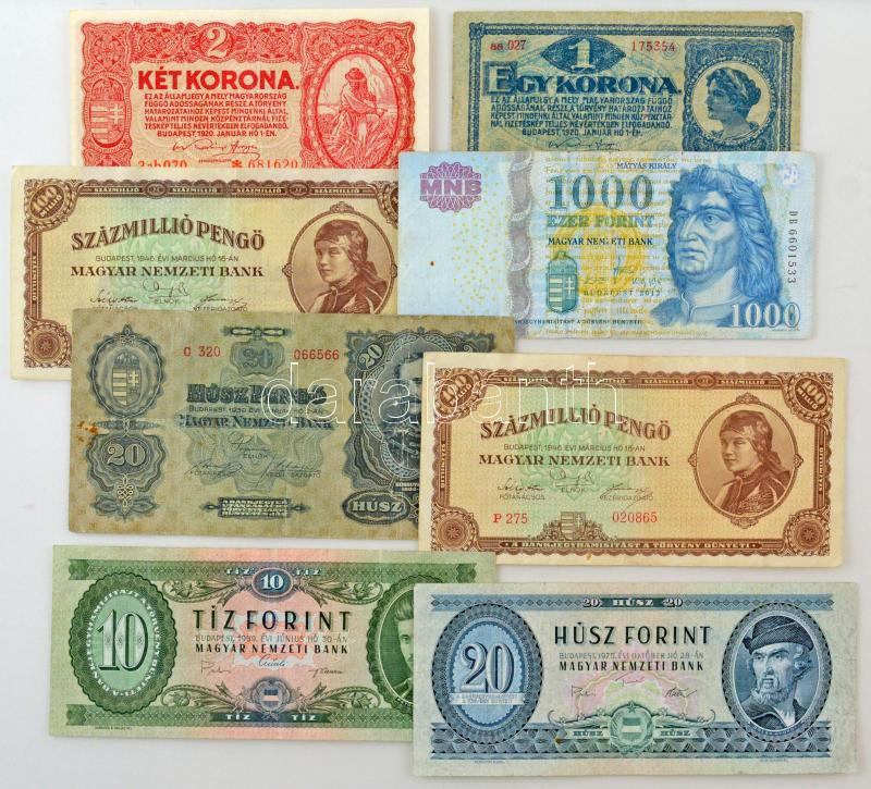 Beschreibung: 1920. 1K + 2K + 1930. 20P + 1946. 100.000.000P (2x) + 1969. 10Ft + 1975. 20Ft + 2012. 1000Ft T:F,VG