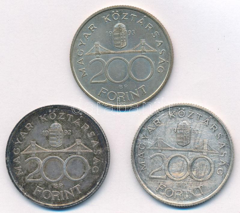 1992-1993. 200Ft Ag "MNB" (3db) T:XF,VF Adamo F13, F13.1 https://www.darabanth.com/de/442-Fernauktion/442.0/Numismatik/Ungarische-Munzen-und-Munzen-mit-ungarischem-Munzzeichen~1500008/1992-1993-200Ft-Ag-MNB-3db-TXF-VF-Adamo-F13-F131~II2814082