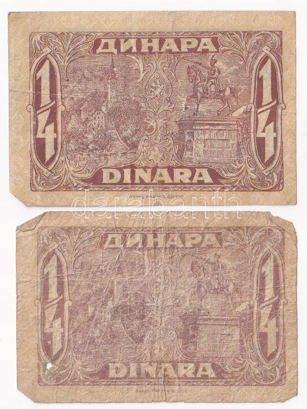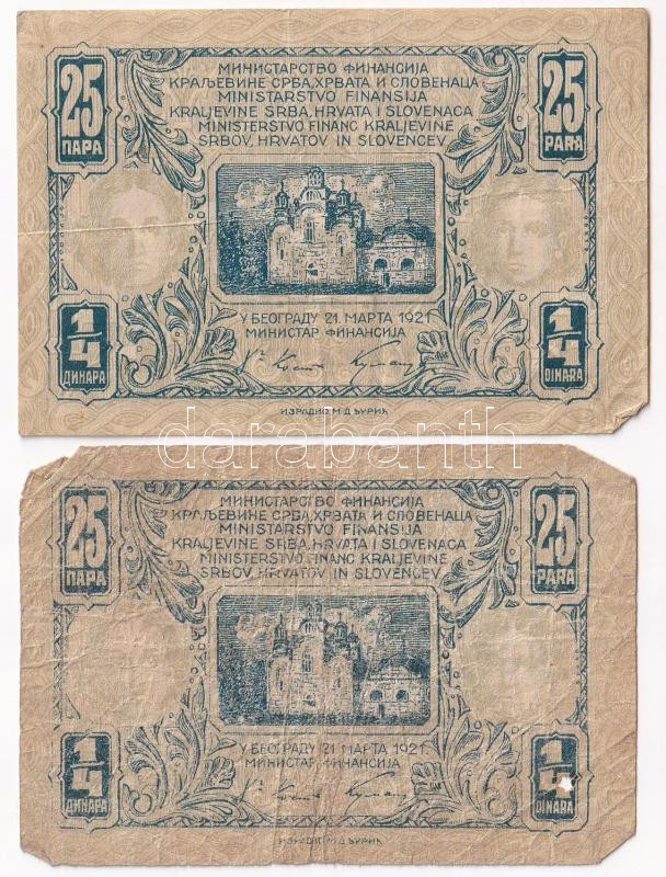 Jugoszlávia / Szerb-Horvát-Szlovén Királyság 1921. 25p / 1/4D (2x) T:F... https://www.darabanth.com/de/442-Fernauktion/442.0/Numismatik/Weltweit-Banknoten~1500014/Jugoszlavia-Szerb-Horvat-Szloven-Kiralysag-1921-25p-14D-2x-TF-VG-Yugoslavia-Kingdom~II2906159