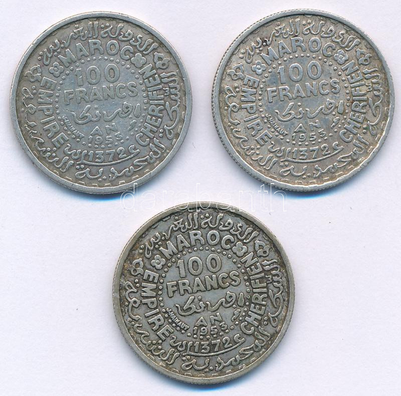 Marokkó 1953. 100Fr Ag "V. Mohammed" (3x) T:XF,VF patina Morocco 1953. 100 Francs Ag "Mohammed V" (3x) C:XF,VF patina Krause Y#52