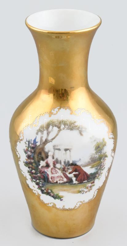 Beschreibung: Iris porcelán Szeged historizáló jelenetes váza, jelzéssel, kis kopottsággal, m: 17,5 cm