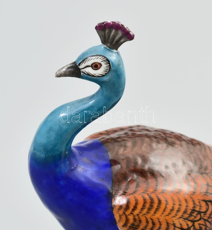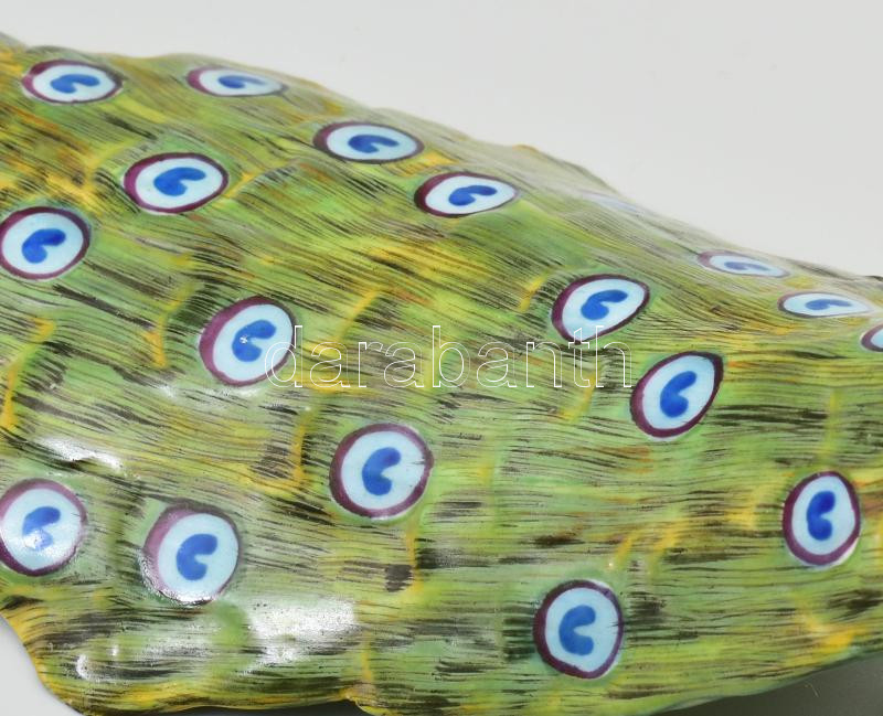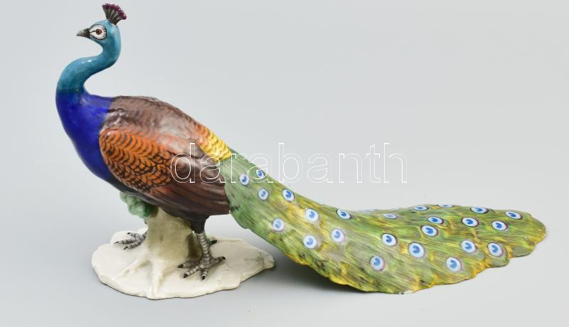Beschreibung: cca 1900 Sitzendorf páva, jelzett, kopással, ragasztott bóbitával, h: 30 cm, m: 16,5 cm