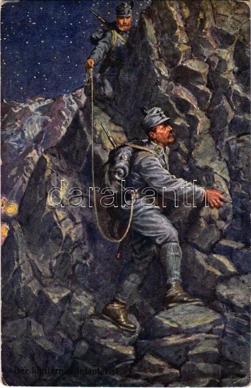 Beschreibung: 1916 Der kletternde Infanterist. Offizielle Karte für Rotes Kreuz, Kreigsfürsorgeamt Kriegshilfsbüro Nr. 206. / WWI Austro-Hungarian K.u.K. military art postcard, mountain troops, climbing infantryman s: Kuderna (EK)