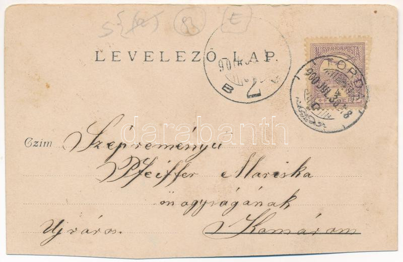1900 Torda, Turda; Fő tér, Cs. Mike Márton (ezelőtt Wolff) gyógyszertára, Dick Vilmos és Társa és Borza Zsigmond üzlete, Szálloda, bor és sörcsarnok a vadász kürthöz / main square, shops, hotel, and beer hall, pharmacy. photo (vágott / cut)