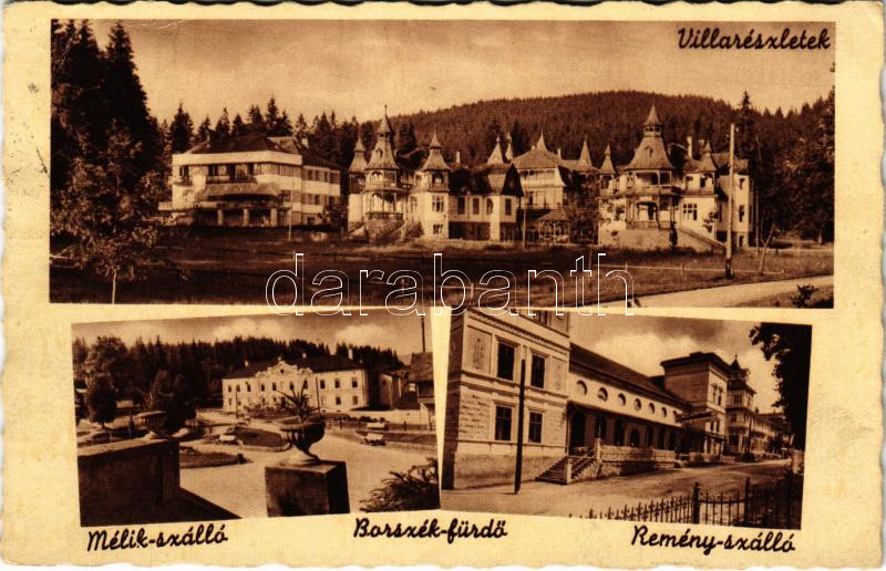 1942 Borszék, Borsec; Villa részletek, Mélik szálló, Remény szálloda /... https://www.darabanth.com/de/443-Fernauktion/443.0/Ansichtskarten/Siebenburgen~2000006/1942-Borszek-Borsec-Villa-reszletek-Melik-szallo-Remeny-szalloda-spa-villas-hotels-C3~II2886622
