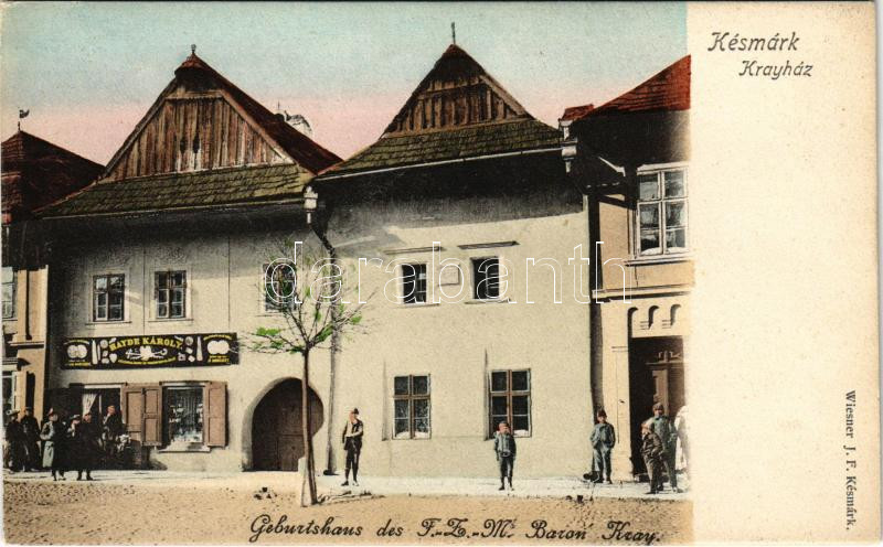 Késmárk, Kezmarok; Kray ház (krajovai és topolyai báró Kray Pál szülőháza), Hayde Károly üzlete. Wiesner J. F. kiadása / Geburtshaus des Baron Kray / birthplace of Baron Paul Kray of Krajova and Topolya, shop