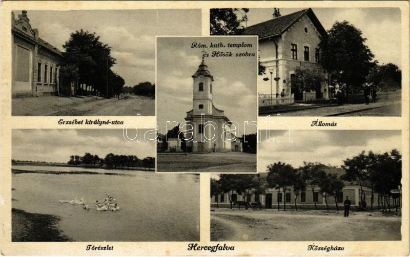 Beschreibung: 1934 Hercegfalva (Mezőfalva), Erzsébet királyné utca, tó, községháza, római katolikus templom, Hősök szobra, vasútállomás