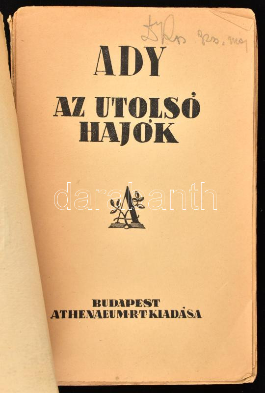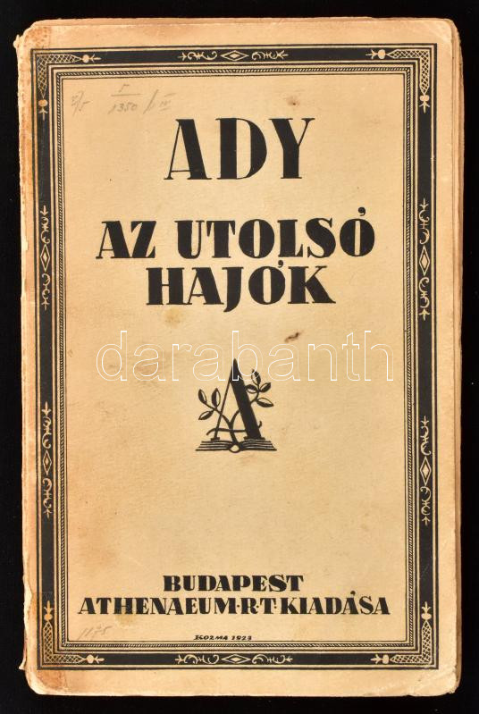 Ady Endre: Az utolsó hajók. Bp.,(1923), Athenaeum, 158 p. A bekötött papírborító Kozma Lajos (1884-1948) munkája. Első kiadás. Kiadói papírkötés, szakadt, foltos borítóval, kijáró lapokkal.