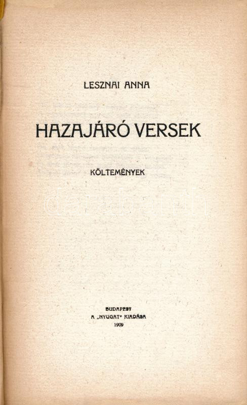 Lesznai Anna: Hazajáró versek. Bp., 1909, A Nyugat Kiadása. Korabeli a... https://www.darabanth.com/de/443-Fernauktion/443.0/Bucher/Bucher-Andere-kuriositaten~1000029/Lesznai-Anna-Hazajaro-versek-Bp-1909-A-Nyugat-Kiadasa-Korabeli-aranyozott-kisse-kopott-ge~II2915489