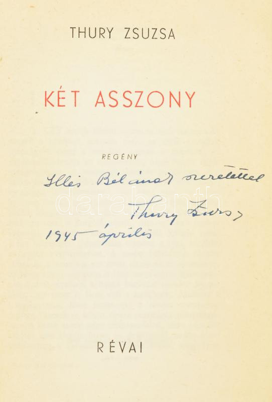 Thury Zsuzsa: Két asszony. A szerző által Illés Béla (1895-1974) kétszeres Kossuth-díjas író, újságírónak DEDIKÁLT! Bp., 1942, Révai. Kiadói vászonkötésben, kissé foltos borítóval, kissé sérült kötéssel, helyenként foltos lapokkal.