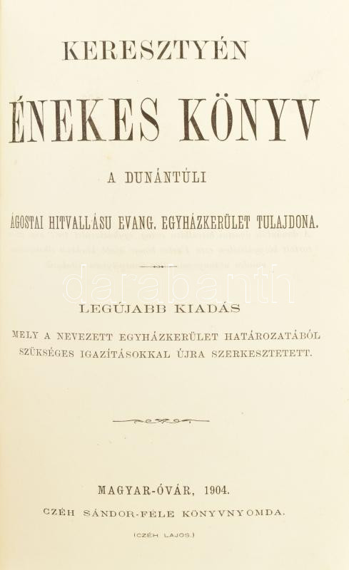 Keresztyén énekes könyv, 1904, Czéh Sándor-féle Könyvnyomda, Magyar-Óvár, részben bársonyborítással, bakelit és réz díszítménnyel, aranyozott lapszélekkel, szép állapotban