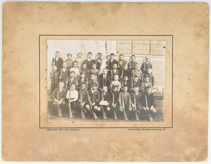 1930 Kisfiúk puskás osztályfotó, a hátoldalakon az osztály és a fiúk neveivel, Pesterzsébet, "Apollo" Roth Jenő műterme, foltos kartonnal, a fotón karcolásokkal, 11x15 cm