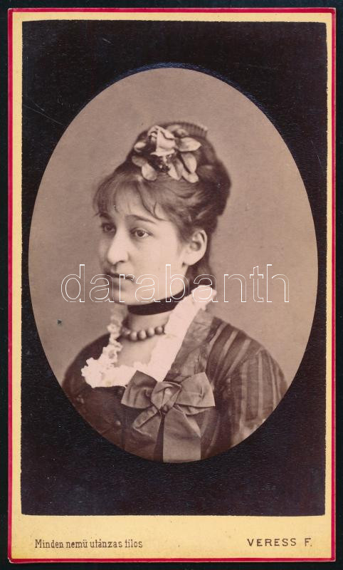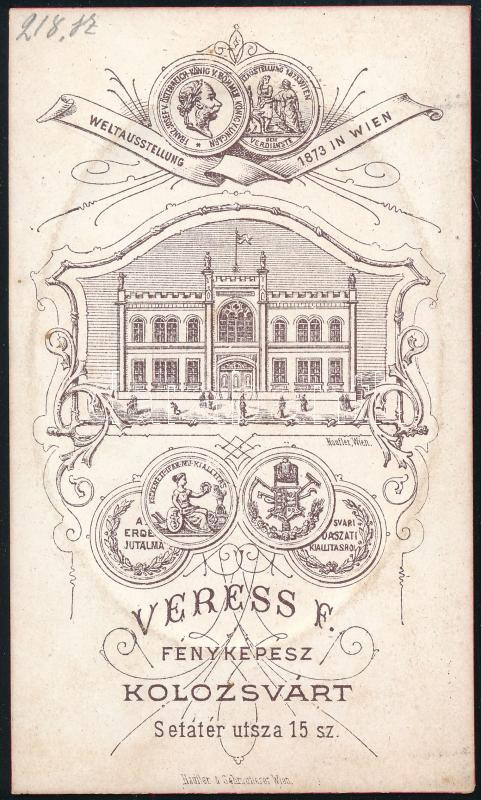 cca 1873 Fiatal hölgy portréja, keményhátú dombornyomott fotó Veress Ferenc kolozsvári műterméből, versoján a műterem illusztrációjával és 218 számozássaal, 10,5×6 cm