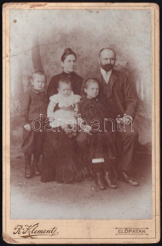 cca 1898 Család portréja kisgyerekekkel, keményhátú fotó Robert Klement fényképész és festő előpataki (erdélyi) műterméből, törésnyommal, kissé foltos, 16×10,5 cm. Ritka!
