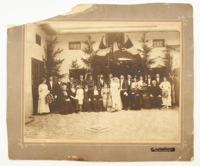 cca 1900 Esküvői csoportkép magyar zászlókkal, nagyméretű fotó kartonon, Wykopal János fényképész felvétele (Felvidék, Zsolna / Pöstyén), a karton erősen sérült, 26,5x20 cm