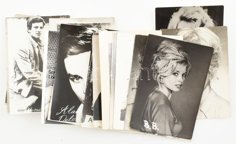 cca 1960-1970 Vegyes külföldi színészfotó tétel, fotók és nyomatok vegyesen, 22 db, Brigitte Bardot, Sophie Loren, Alain Delon, Jean-Paul Belmondo, cca 9x6 cm