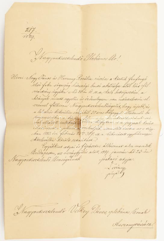 Beschreibung: 1889 Schlauch Lőrinc (1824-1902) nagyváradi püspök (később bíboros) levele házassági bontó akadályok ügyében, Asszonyvásárára, Velkey Dénes plébánosnak, a püspök autográf aláírásával, szakadt.