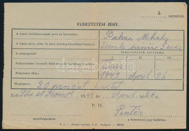 1944 Pilisszentkereszt, tehén fedeztetési jegy https://www.darabanth.com/de/443-Fernauktion/443.0/Kunst-Dokumente-andere-Sammelgebiete/Dokument~500021/1944-Pilisszentkereszt-tehen-fedeztetesi-jegy~II2915016
