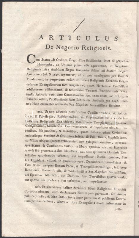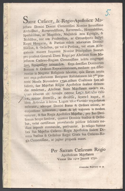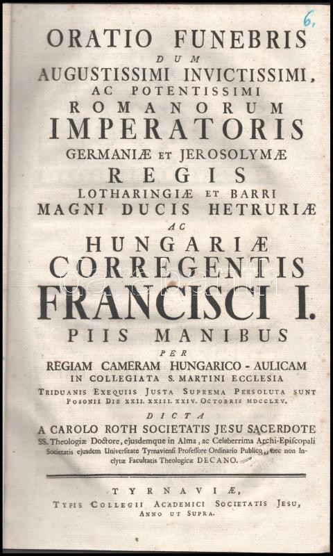 1765-1791 Alexander Pásztory: Sacrae Caesareae et Regio-Apostolicae Majestatis... Benignissime intimandum. Erga demissam dominorum statuum etordinum repraesentationem... in negotio religiones subortas, quia illarum intuitu nec erga posteriorem benignam resolutionem sub 7ma... mensis Novembris 1790 editam coalitionis spes adfulserit, suae Majestati... finaliter dirimendas detulerunt... Viennae die 18va. Possonii, 1791, Prostat apud Simonem Petrum Weber, 4 sztl. lev. Hozzákötve: Carolo Roth: Oratio funebris dum augustissimi invictissimi, ac potentissimi Romanorum imperatoris ... ac Hungariae corregentis Francisci I. piis manibus per regiam cameram Hungarico-aulicam in collegiata S. Martini ecclesia triduanis exequiis justa suprema persoluta sunt Posonii die XXII.,XXIII., XXIV. Octobris MDCCLXV. Tyrnaviae, (1765), Typis Collegii Acaemici Societatis Jesu, 16 sztl. lev. Papírkötés, javított gerinccel, a második részben szúrágta lyukakkal a lapokon.