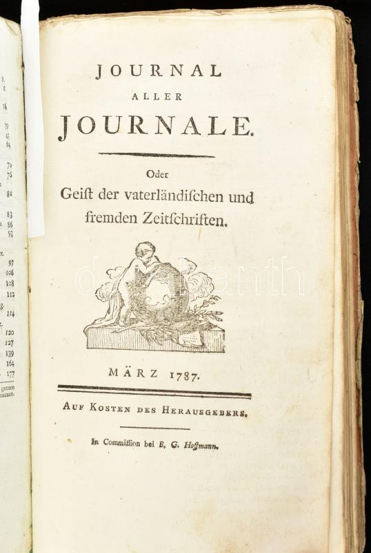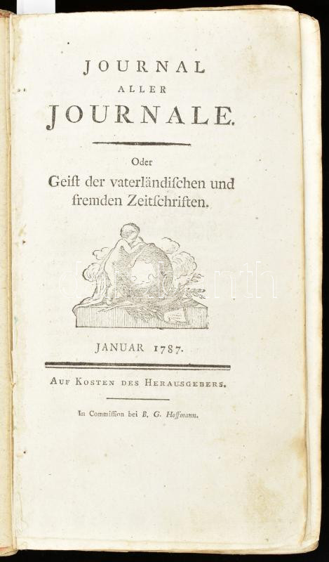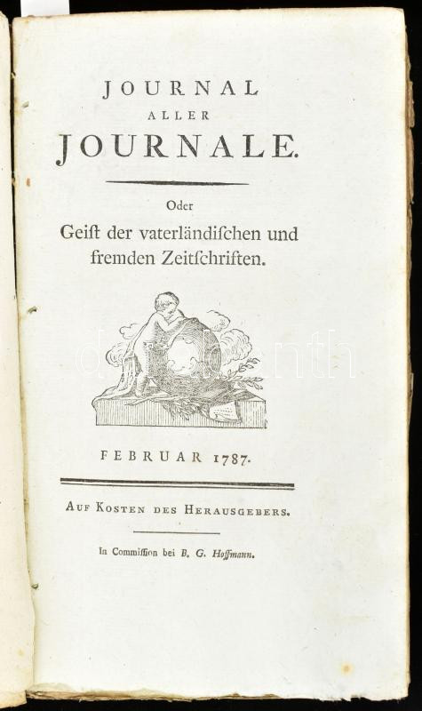 1787 Journale aller Journale. Oder Geist der vaterländischen und fremden Zeitschriften. 1787. Januar - Mäz. Hamburg, ,Johann Jakob Knauf, 195+1; 199+1;+191+1 p. Német nyelven. Kartonált papírkötés, kopott borítóval, sérült gerinccel.