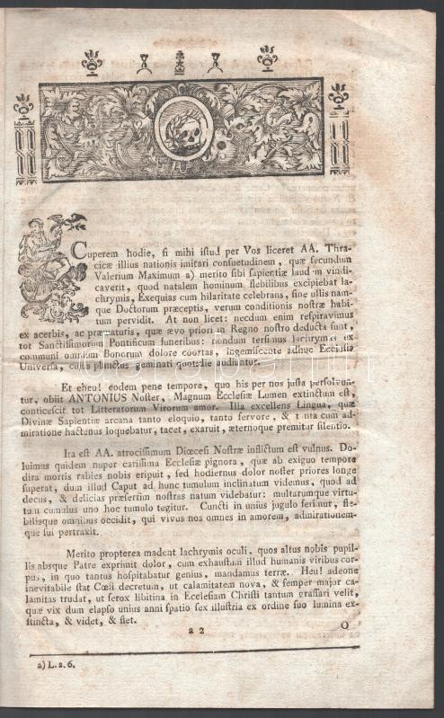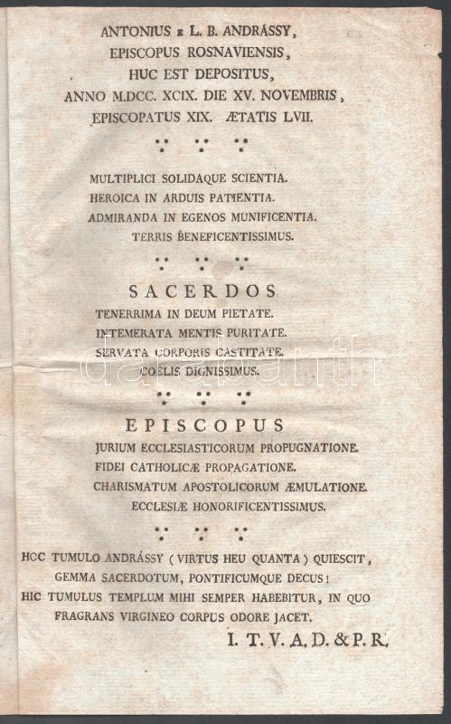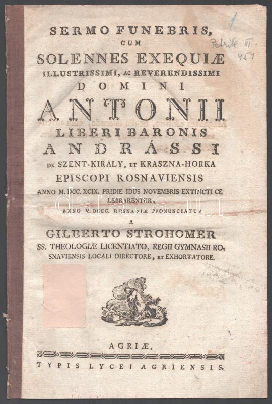 1799 Krasznahorkai és csíkszentkirályi báró Andrássy Antal (1742-1799) rozsnyói püspök nyomtatott halotti beszéde. Eger, é.n., Egri Érseki Líceumi Nyomda. XII+1 p. Latin nyelven. Javított papírkötésben, javított és kissé foltos borítóval, helyenként kissé foltos lapokkal.