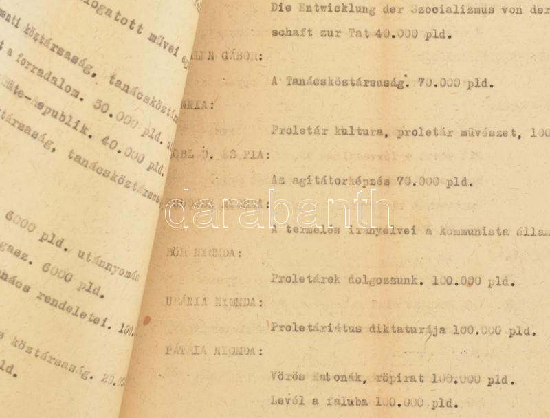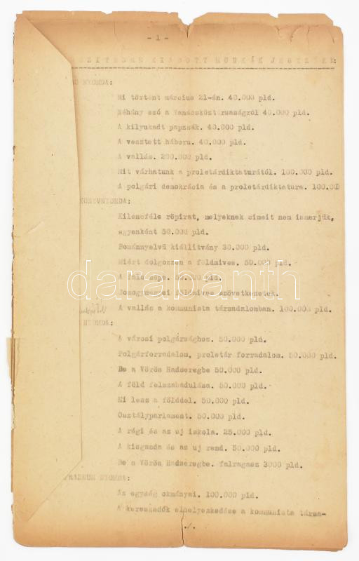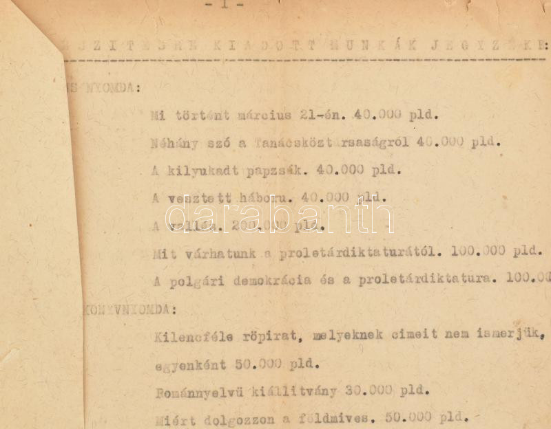 1919 "Készítésre kiadott munkák jegyzéke". A budapesti nyomdák számára utasításba adott röpiratok, politikai és propaganda kiadványok, hirdetmények listája, címekkel és nyomtatási példányszámokkal. Gépirat, fűzve, kisebb sérülésekkel, 19 p.