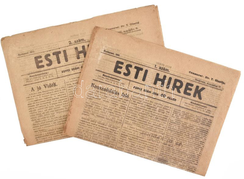 1919. VIII. 17 és 18., Esti Hírek 1-2. sz. Tanácsköztársaság bukása ut... https://www.darabanth.com/de/443-Fernauktion/443.0/Kunst-Dokumente-andere-Sammelgebiete/Drucksachen~1000005/1919-VIII-17-es-18-Esti-Hirek-1-2-sz-Tanacskoztarsasag-bukasa-utani-elso-fovarosi-n~II2924456
