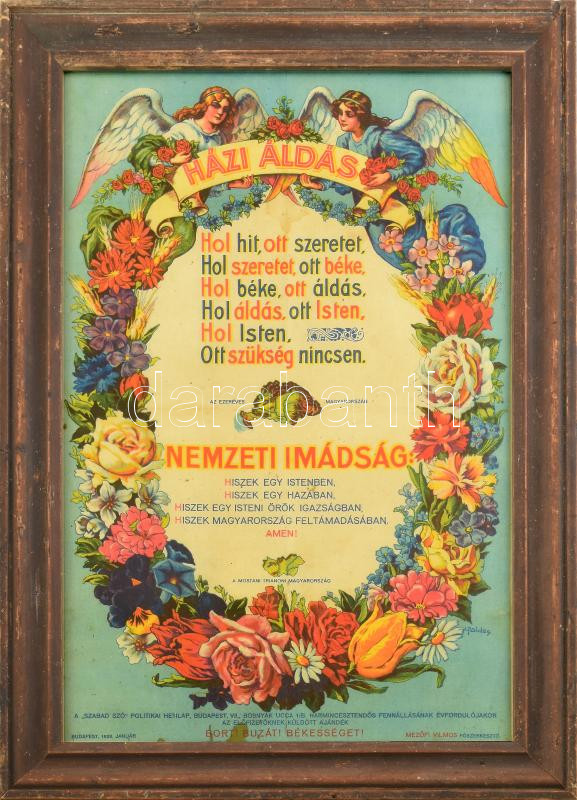 1928 Házi áldás, irredenta nemzeti imádsággal, "Szabad Szó" politikai hetilap előfizetőinek küldött ajándék, ofszet nyomat, papír, kissé foltos, üvegezett fakeretben, 44,5x29,5 cm