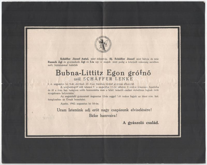 1942 Bubna Littitz Egon grófnő gyászjelentése https://www.darabanth.com/de/443-Fernauktion/443.0/Kunst-Dokumente-andere-Sammelgebiete/Drucksachen~1000005/1942-Bubna-Littitz-Egon-grofno-gyaszjelentese~II2918045
