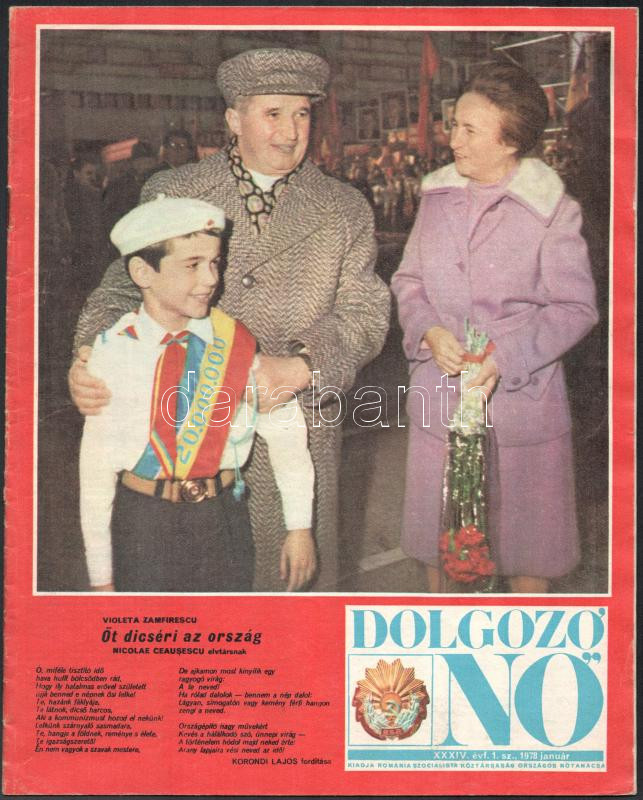 1978 Dolgozó Nő XXXIV. évf. 1. sz., 1978. január (Románia Szocialista Köztársaság Országos Nőtanácsának magyar nyelvű folyóirata), a címlapon Elena és Nicolae Ceausescu, fekete-fehér és színes fotókkal