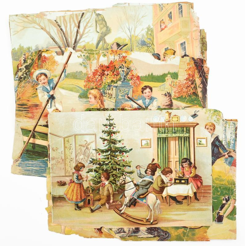 Beschreibung: cca 1900 10 db vidám életkép gyerekekkel. Színes nyomat, papír, erősen sérült. 19x26 és 22,5x31 cm közötti méretekben.