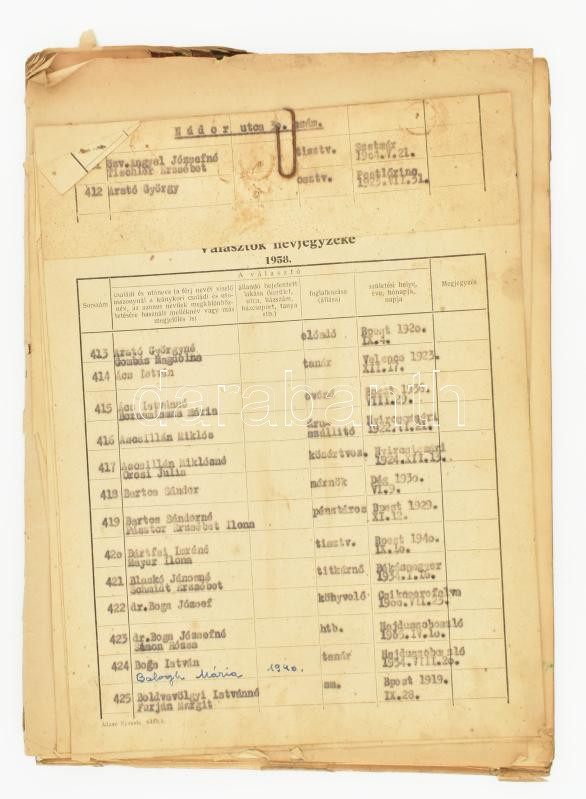cca 1930-1958 Bp., Nádor u. 30 lakóinak választói névjegyzéke 1958-ból... https://www.darabanth.com/de/443-Fernauktion/443.0/Kunst-Dokumente-andere-Sammelgebiete/Drucksachen~1000005/cca-1930-1958-Bp-Nador-u-30-lakoinak-valasztoi-nevjegyzeke-1958-bol-es-lakonevsor-adato~II2924749