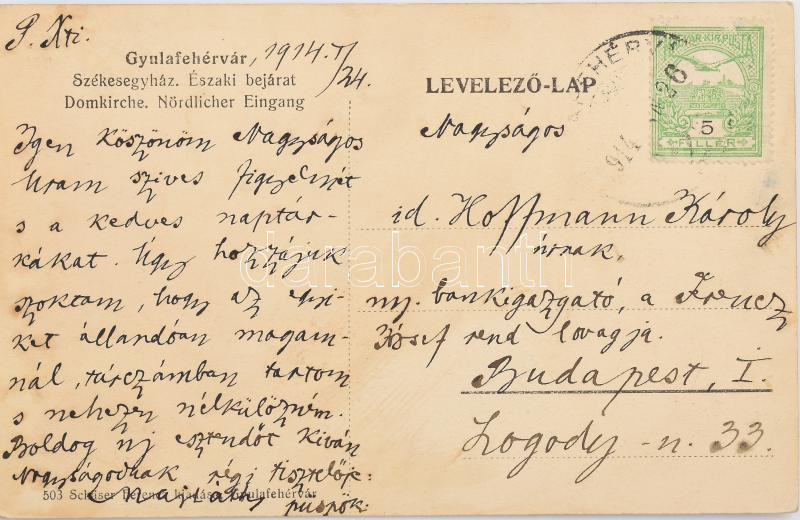 Beschreibung: 1914 Majláth Gusztáv Károly (1864-1940) erdélyi püspök autográf képeslapja Gyulafehérvárt ábrázoló