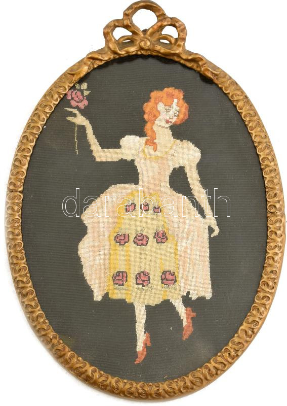 Beschreibung: Ovális fa képkeret, üvegezett, női alak gobelinnel, szép állapotban, 31x21 cm