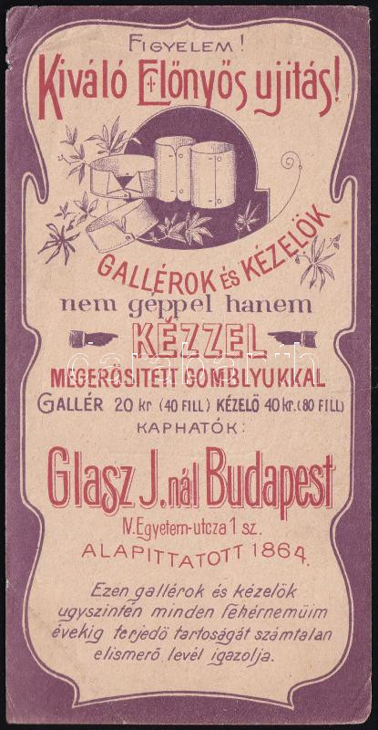 Gallérok és kézelők Glasz J. Budapest, IV., Egyetem u. 1., számolócédu... https://www.darabanth.com/de/443-Fernauktion/443.0/Kunst-Dokumente-andere-Sammelgebiete/Werbungen~500025/Gallerok-es-kezelok-Glasz-J-Budapest-IV-Egyetem-u-1-szamolocedula-apro-serulessel~II2924551