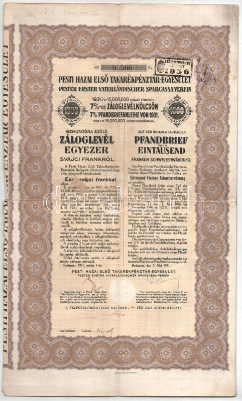 Budapest 1931. "Pesti Hazai Első Takarékpénztár-Egyesület" záloglevele 1000 svájci frankról magyar és német nyelven szárazpecséttel, felülbélyegzéssel T:F ragasztónyom
