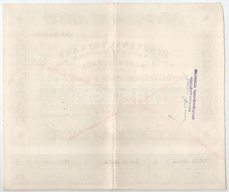 Budapest 1946. "Pesti Magyar Kereskedelmi Bank" részvényutalvány 5 részvényről egyben, összesen 250P-ről, szárazpecséttel, bélyegzéssel, szelvényekkel T:VF