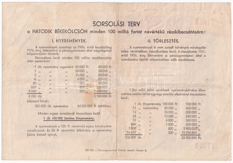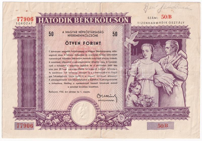 Budapest 1955. "Hatodik Békekölcsön" nyereménykölcsön kötvény 50Ft-ról... https://www.darabanth.com/de/443-Fernauktion/443.0/Numismatik/Aktien-und-Tickets~1500005/Budapest-1955-Hatodik-Bekekolcson-nyeremenykolcson-kotveny-50Ft-rol-szarazpecsettel-T~II2919351