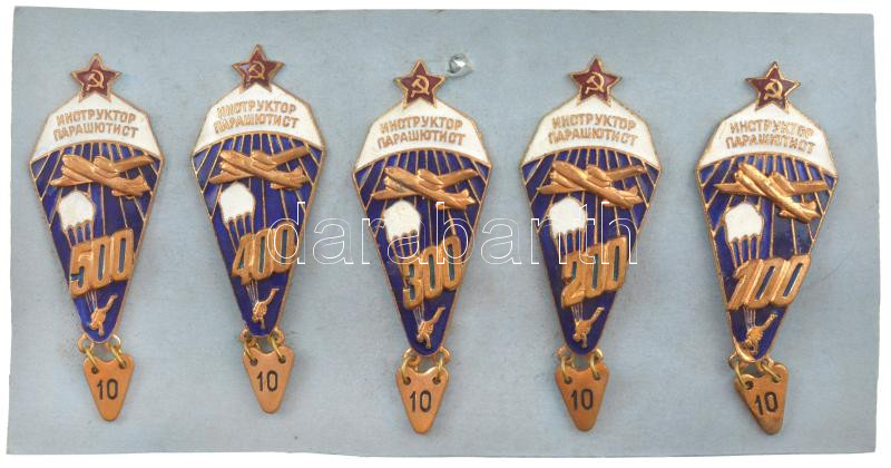 Soviet Union ND "Parachute instructor badge 100 - 200 - 300 - 400 - 500 jumps" (5xdiff) enamelled metal badges with screw backs, all with Nr. "10/25" tab (~67x26mm) C:AU,XF with small enamel error in it