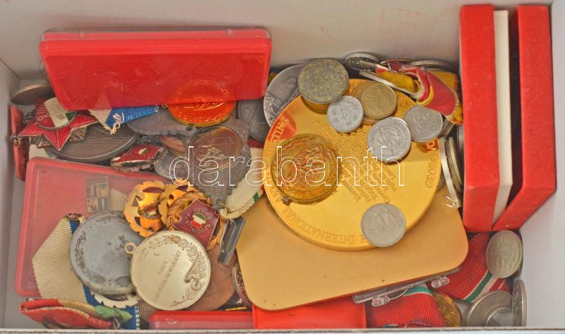 Beschreibung: Doboznyi vegyes, magyar és külföldi szocialista jelvény, emlékérem, kitüntetés, sportérem, fémpénz tétel, közte sok tokos T:vegyes