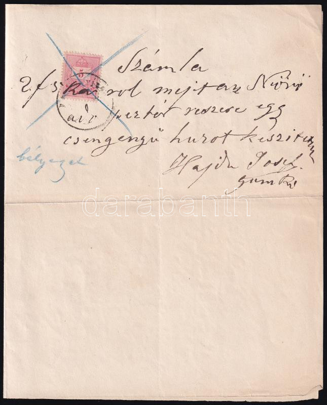 Beschreibung: 1874 5kr színesszámú bélyeg számlailletékként felhasználva.