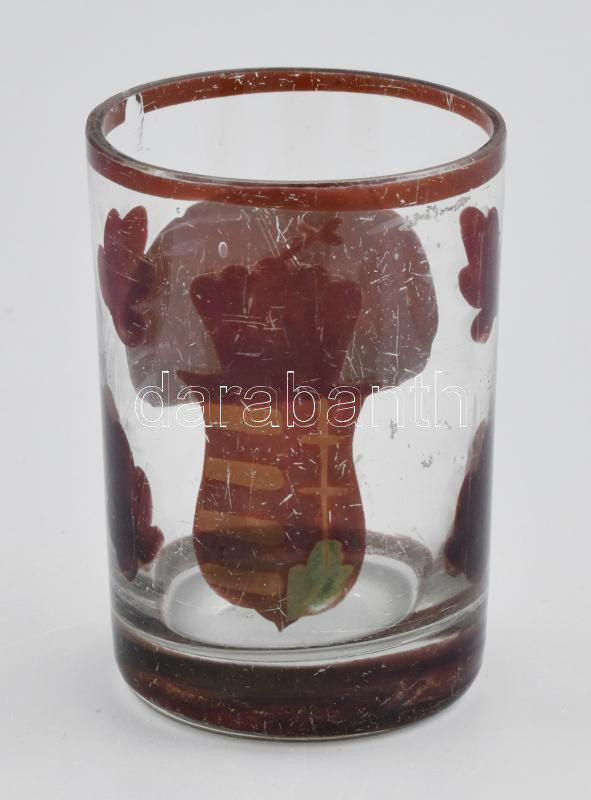 Címeres üveg pohár. bíborszín, kézzel festett XIX. sz, kopott, kis pat... https://www.darabanth.com/de/443-Fernauktion/443.0/Porzellan-Keramik-Glass/Glaser~500007/Cimeres-uveg-pohar-biborszin-kezzel-festett-XIX-sz-kopott-kis-pattanassal-m-8-5-cm~II2919792