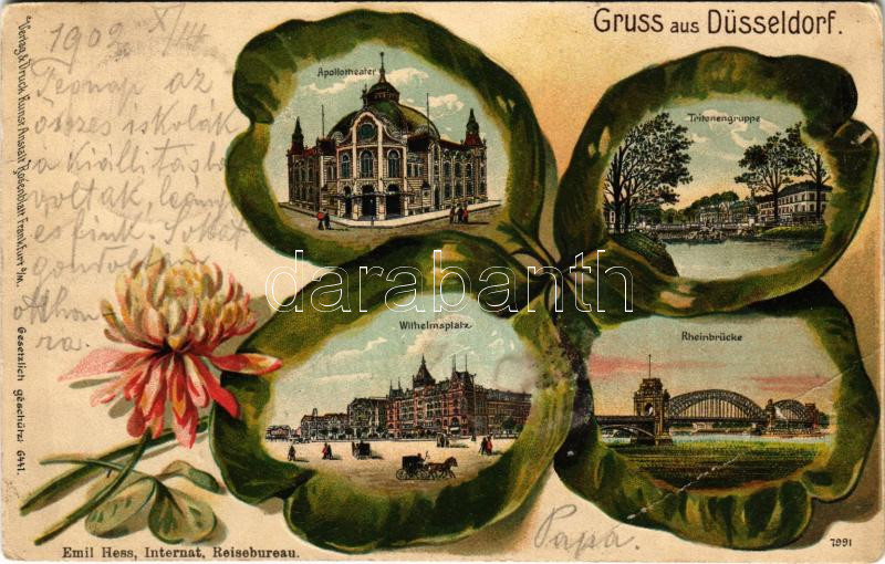 Beschreibung: 1909 Düsseldorf, Apollotheater, Tritonengruppe, Wilhelmsplatz, Rheinbrücke / theatre, square, bridge. Verlag & Druck Kunstanstalt Rosenblatt Emb. litho (pinhole)