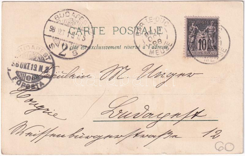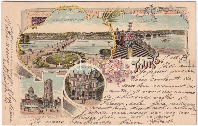 1898 (Vorläufer) Tours, Le Pont de Pierre et la Tranchée, Hotel Gouin, La Tour Charlemagne et i Église Saint-Martin / bridge, hotel, tower, church. Art Nouveau, floral, litho