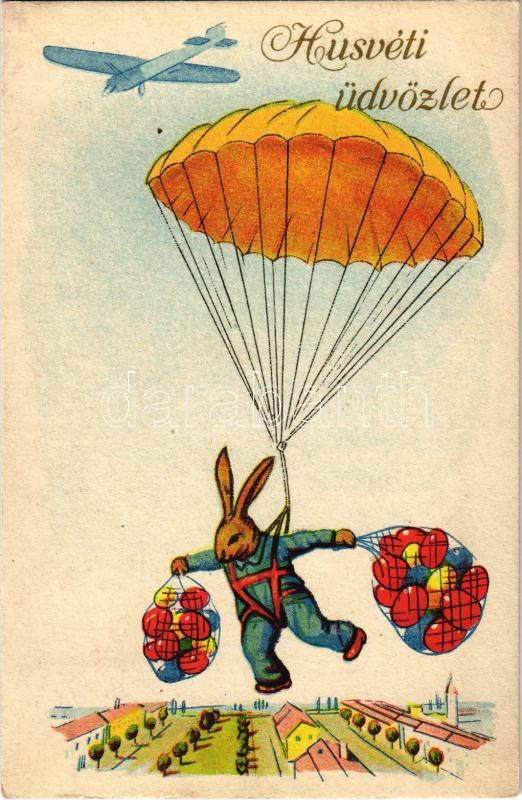 1941 Húsvéti üdvözlet / Easter greeting art postcard, rabbit with para... https://www.darabanth.com/de/444-Fernauktion/444.0/Ansichtskarten/GruC39Fkarten-Feste~2000080/1941-Husveti-udvozlet-Easter-greeting-art-postcard-rabbit-with-parachute-and-eggs-EK~II2928368