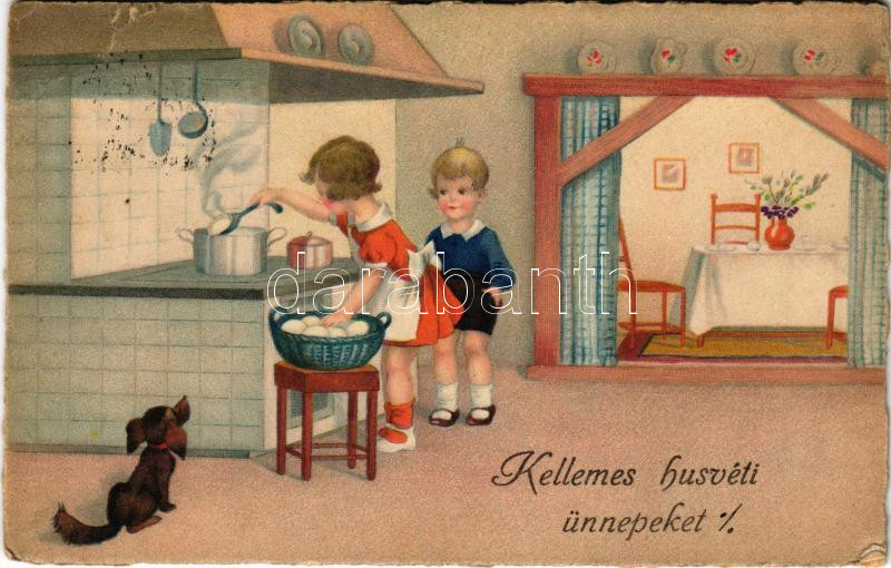 Beschreibung: Kellemes húsvéti ünnepeket / Easter greeting art postcard, children boiling eggs. ERIKA Nr. 2053. (szakadás / tear)