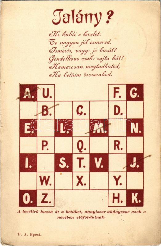 1902 Talány / riddle (EK) https://www.darabanth.com/de/444-Fernauktion/444.0/Ansichtskarten/Humor~2000036/1902-Talany-riddle-EK~II2930543