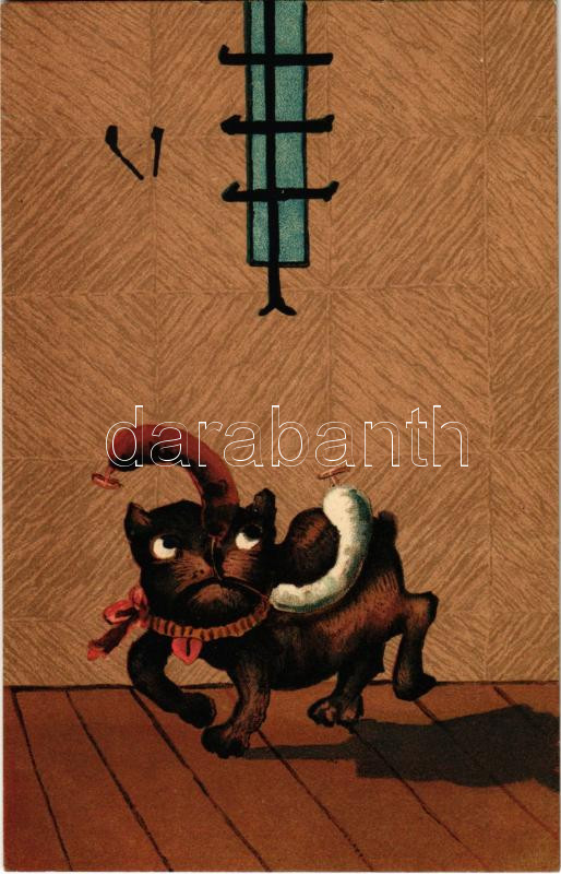 Beschreibung: 1912 Kutya a falról leszedett kolbászokkal / dog with sausages, humour. litho