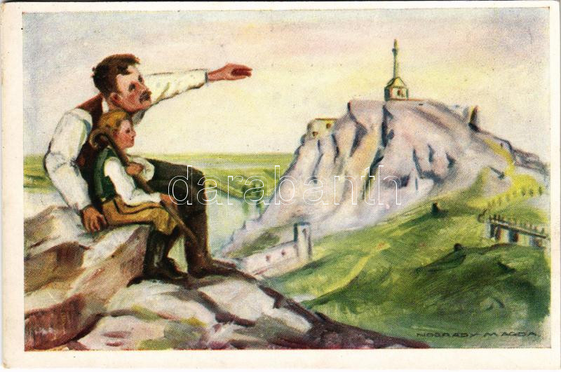 Dévény, Theben a. d. Donau, Devín (Pozsony, Pressburg, Bratislava); Dévényi ezredéves emlék. Kiadja a Magyar Nemzeti Szövetség, Don Bosco Ny. / Hungarian irredenta art postcard, Hungarian Millennium monument s: Nógrády Magda