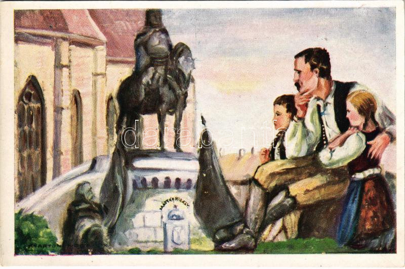 Kolozsvár, Cluj; "Lesz még kikelet Kolozsvár felett", Mátyás király szobor, népviselet. Kiadja a Magyar Nemzeti Szövetség, Don Bosco nyomda / Hungarian irredenta propaganda, Mathias Rex statue, traditional costumes, folklore s: Márton, Nógrády M.